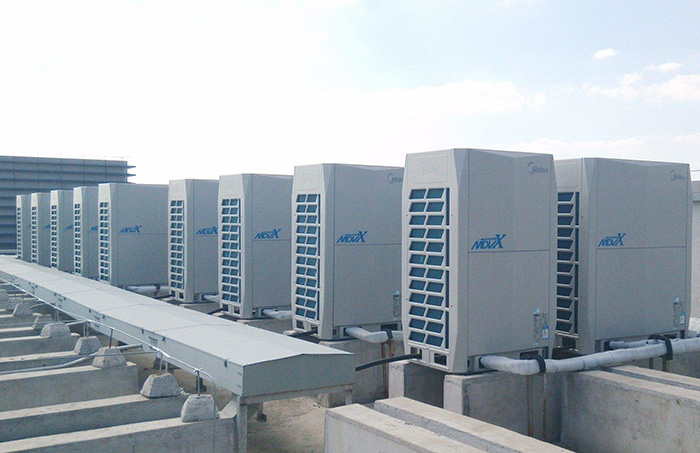 2、和传统中央空调比较不需要另设空调机房,室外机可放置于屋顶或地面,节省了大量有限的建筑面积,可节省出地下室用来做停车场,而且不需要冷却塔、循环水泵、软化水等繁琐的附属设备,设备管理及维修明显减少。